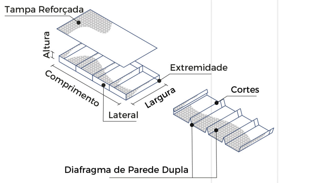 Confeccionados com malha hexagonal de dupla torção de abertura 6 x 8 (cm) produzida com arames de aço de baixo teor de carbono (BTC), revestidos com a liga Zinco / Alumínio, fio de diâmetro 2,00 mm (malha) e fio de diâmetro 2,40 mm (borda) e adicionalmente revestidos com Policloreto de Vinila (PVC), são subdivididos em células por diafragmas que reforçam os elementos, aumentando a rigidez das estruturas construídas.